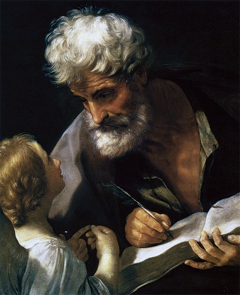 Gęsie pióro zapisuje kolejne słowa na kartach grubej księgi. Autor, pisząc, nie patrzy jednak na swoje dzieło. Intensywnie wpatruje się za to w oczy stojącego obok anioła. Tak powstawały Ewangelie.