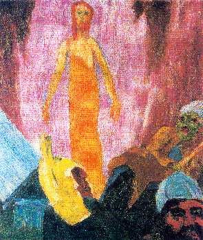 „Zmartwychwstanie”- obraz dwu planowy o przewadze ciepłej nienaturalnej kolorystyki, mająca mistyczny wymiar. Na pierwszym planie są ukazane zdeformowane, ledwo widoczne twarzy rzymskich żołnierzy. Tutaj się nasuwa fragment „A gdy one odeszły, oto niektórzy ze strażników przyszli do miasta i oznajmili przedniejszym kapłanom wszystko, co się stało. Ci zaś zebrali się ze starszymi i po naradzie dali żołnierzom wiele pieniędzy, mówiąc: Powiadajcie, że uczniowie jego przybyli w nocy i w czasie waszego snu wykradli go” (Mt 28,11-13) oraz „Oni tedy wziąwszy pieniądze uczynili, jak ich nauczono(...)” (Mt 28,15). Na drugim planie widzimy ciepłą postać Chrystusa o spokojnej pełnej dobroci twarzy. Różowy płomień za Zbawicielem podkreśla duchowość i tajemnicę. Postać Jezusa jest namalowana w sposób bardzo swobody i uproszczony sprawiający wrażenie snu. Jak sam artysta pisze „Trzeba było, abym zdobył mą artystyczną wolność, co było sprawą skierowaną nie do Boga równie surowego i niewzruszonego co asyryjski satrapa, lecz do Boga we mnie, równie płonącego i świętego co miłość Chrystusa”.