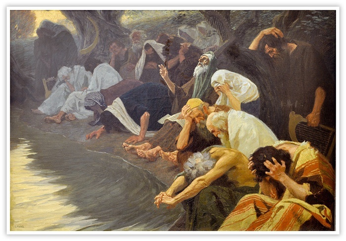 To ilustracja Psalmu 137(136), rozpoczynającego się słowami: „Nad rzekami Babilonu siedzieliśmy i płakali, wspominając Syjon”. Psalm opowiada o losie ludu wybranego na zesłaniu w Babilonie. Izraelici zostali tam uprowadzeni w 586 r. przed Chr., po zdobyciu Jerozolimy przez króla Nabuchodonozora II. Deportacje były w starożytności często stosowane przez najeźdźców w stosunku do buntowniczych ludów. Niewola babilońska trwała do roku 538 przed Chr., kiedy to król perski Cyrus II Wielki po podbiciu Babilonu wspaniałomyślnie pozwolił Izraelitom wrócić do ojczyzny.