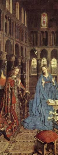 Jesteśmy świadkami sceny Zwiastowania. Słowom archanioła Gabriela skierowanym do Najświętszej Maryi Panny towarzyszą promienie płynące z nieba, przekazywane przez Ducha Świętego, wyobrażonego pod postacią białego gołębia. Obraz zawiera wiele symboli, które w XV wieku rozumieli tylko intelektualiści. Sens dzieła musiał być jednak zrozumiały także przez najmniej wykształconych odbiorców. Dlatego Jan van Eyck postąpił jak autorzy współczesnych komiksów.