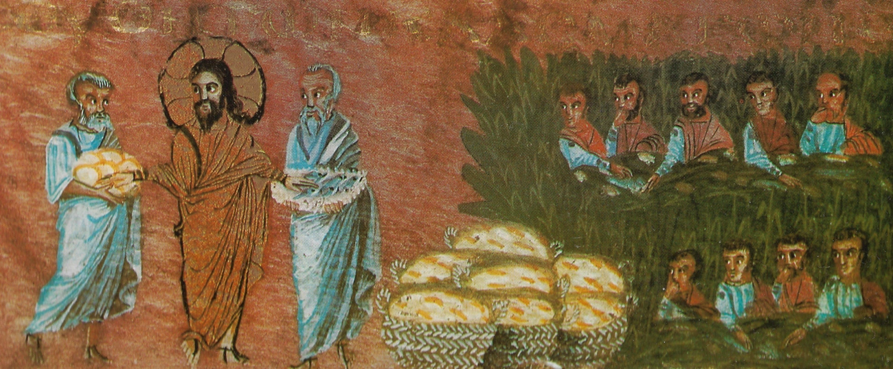 (Jezus) rzekł do Filipa: «Skąd kupimy chleba, aby oni się posilili?» A mówił to wystawiając go na próbę. Wiedział bowiem, co miał czynić. Odpowiedział Mu Filip: «Za dwieście denarów nie wystarczy chleba, aby każdy z nich mógł choć trochę otrzymać». Jeden z uczniów Jego, Andrzej, brat Szymona Piotra, rzekł do Niego: «Jest tu jeden chłopiec, który ma pięć chlebów jęczmiennych i dwie ryby, lecz cóż to jest dla tak wielu?» Jezus zatem rzekł: «Każcie ludziom usiąść!» A w miejscu tym było wiele trawy. Usiedli więc mężczyźni, a liczba ich dochodziła do pięciu tysięcy. Jezus, więc wziął chleby i odmówiwszy dziękczynienie, rozdał siedzącym; podobnie uczynił z rybami, rozdając tyle, ile kto chciał. A gdy się nasycili, rzekł do uczniów: «Zbierzcie pozostałe ułomki, aby nic nie zginęło». Zebrali więc i ułomkami z pięciu chlebów jęczmiennych, które zostały po spożywających, napełnili dwanaście koszów.